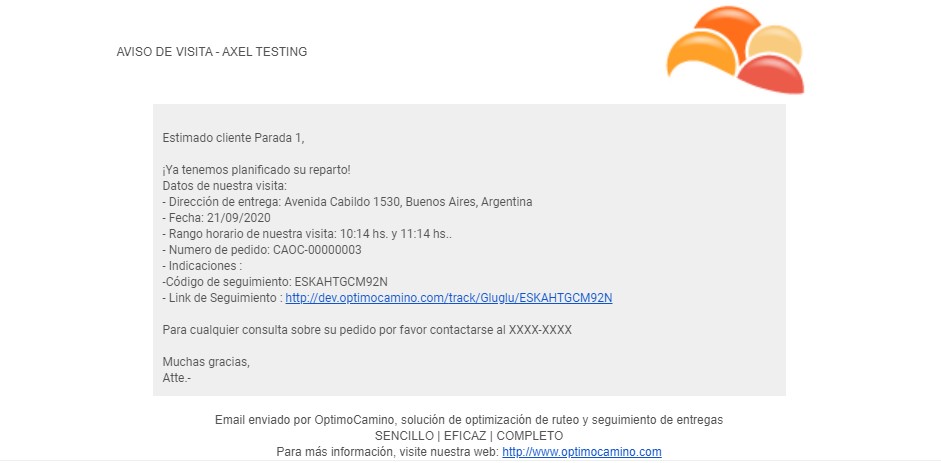 Esta opción nos permitirá enviar un mail a nuestros clientes, avisando que su pedido está planificado, la hora estimada de llegada y el link para seguir su pedido.