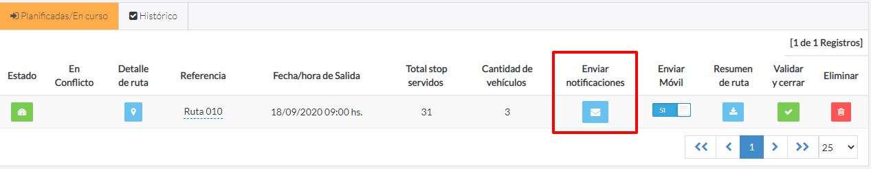 Una vez lanzado el OptimoCamino, desde la sección Caminos del menú principal, tendremos la opción de Enviar Notificaciones haciendo click sobre el icono de correo.
