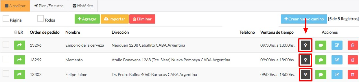 Se podrá visualizar el tracking desde el icono marcado en la captura de abajo. En este caso mostramos la solapa “A realizar” (Lo mismo ocurre en las demás solapas.)