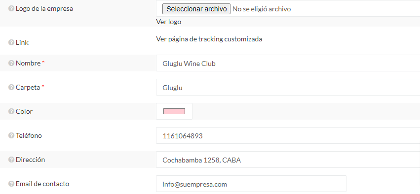 En primer lugar, encontraremos la opción de cargar el logo de su empresa, recomendamos que el mismo sea en formato PNG, y unas dimensiones máximas de 250px de ancho. Luego deben ingresar el Nombre de la empresa, un nombre para la carpeta que aparece en el link del tracking que visualizaran los clientes.