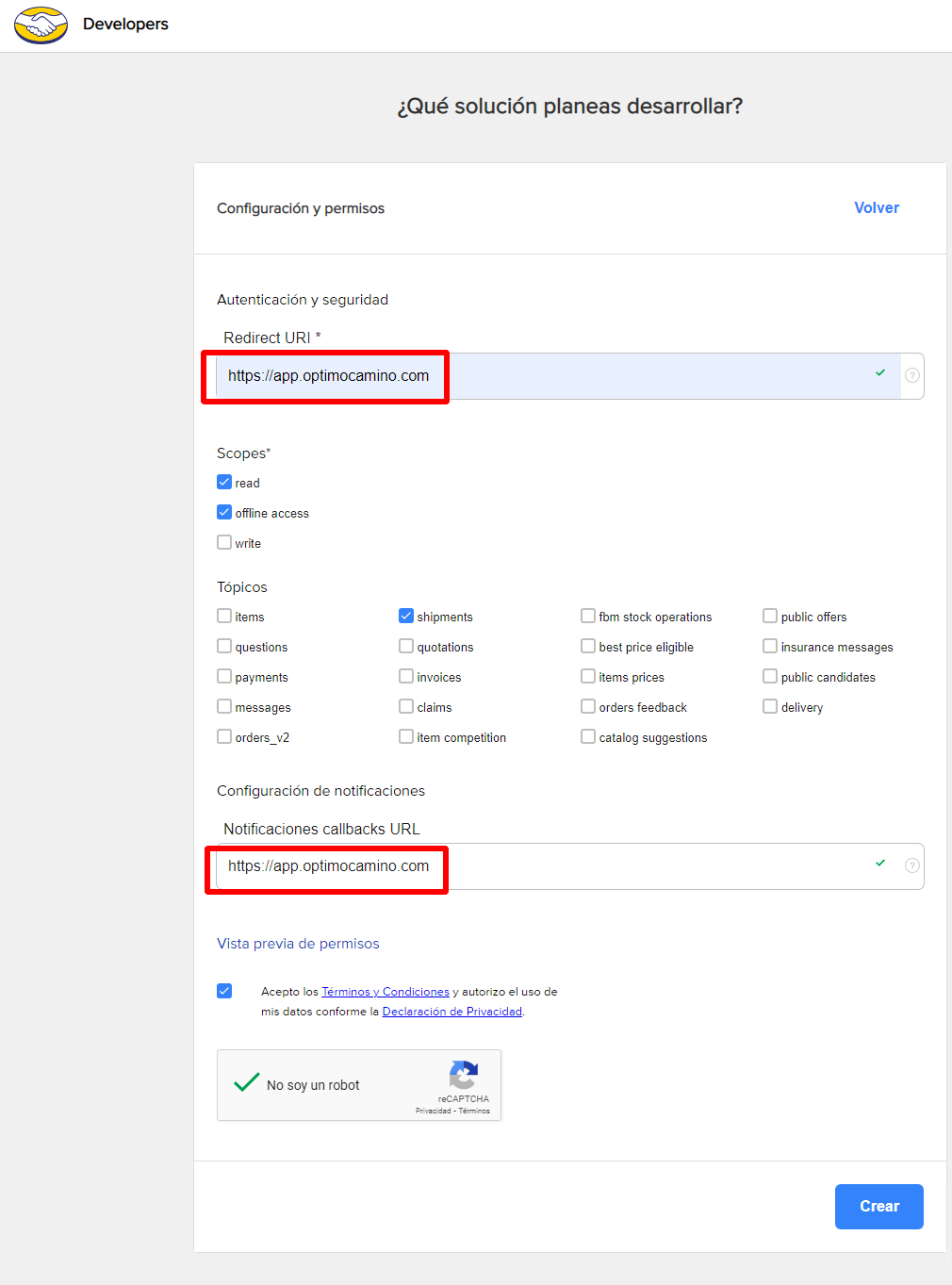 De esta manera ya habremos creado la aplicación en Mercado Libre.