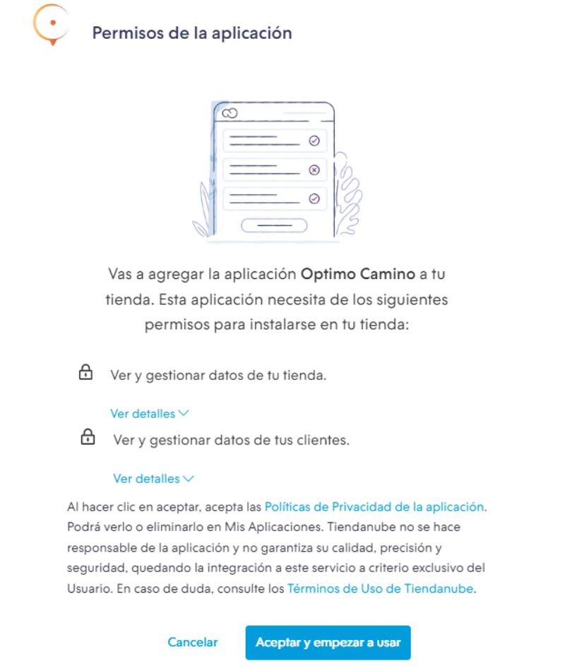 A continuación, aparecerá una ventana en la cual debemos aceptar los permisos haciendo clic en “Aceptar y empezar a usar” de esta manerá se creará el enlace entre OptimoCamino y Tienda Nube.