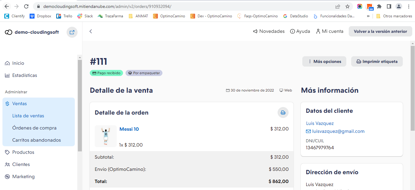 Enviar las ventas de Tienda Nube a OptimoCamino de manera manual