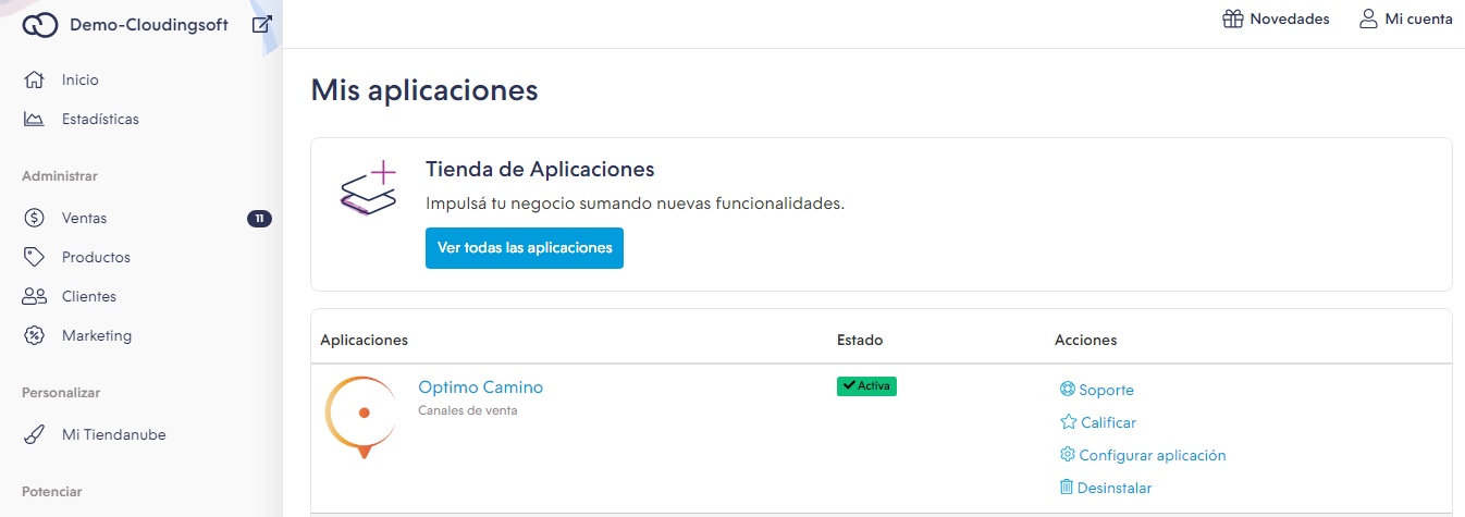 Para enlazar ambas plataformas, primero deben ingresar como administrador a su perfil de Tienda Nube, luego debe acceder a la página de Tienda Nube aplicaciones, buscar la aplicación de OptimoCamino y hacer clic sobre "Instalar aplicación".
