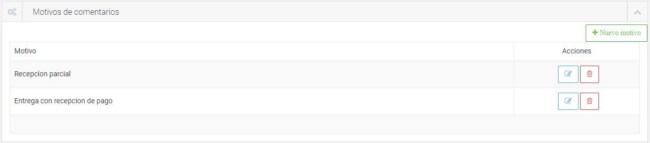Para crear un nuevo motivo de comentario, debe presionar sobre “+Nuevo motivo” e ingresar el mismo, luego debe presionar Aceptar. Este procedimiento se debe realizar por cada uno de los comentarios que quiera añadir. Desde la columna de “Acciones”, podrá editarlos y eliminarlos.