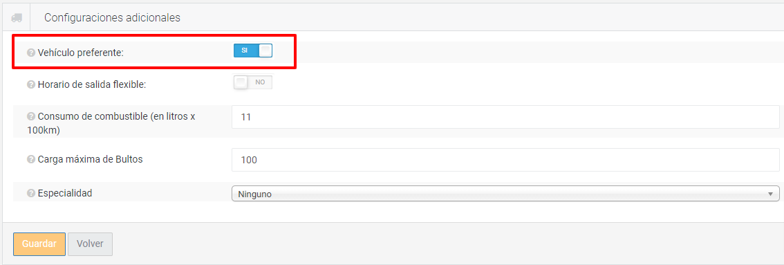 Si acciona este selector, ese vehículo tendrá prioridad sobre el resto sus vehículos al momento de hacer un ruteo. OptimoCamino intentará no dejar afuera del ruteo este vehículo, salvo que todos los vehículos estén como “preferentes”, cosa que no seria de utilidad para dicha funcionalidad.