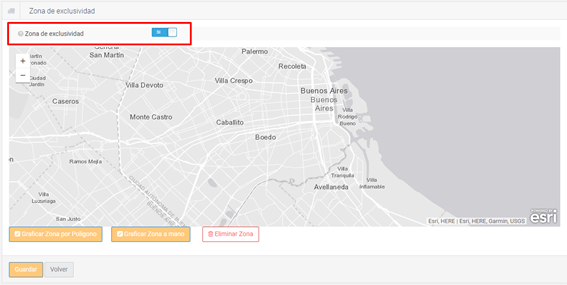 Para configurar la zonificación, debemos ir a "Configuraciones", "Vehículos", seleccionar uno de sus vehículos disponibles y presionar "Editar". Una vez dentro nos dirigimos al apartado "Zona de exclusividad", donde encontraremos el switch de "Zona de exclusividad", al activarlo veremos lo siguiente: